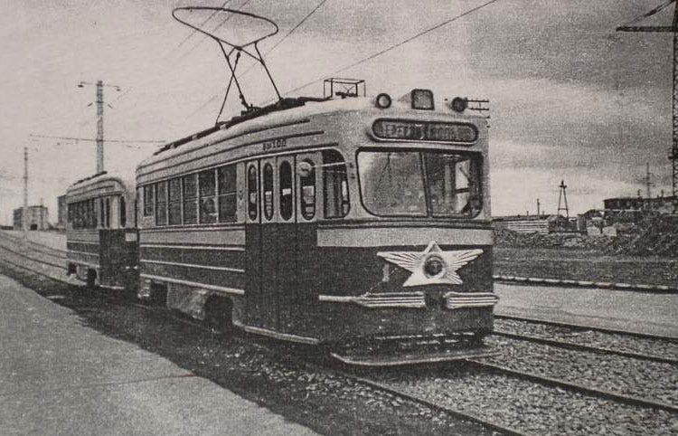 Первый маршрутный трамвай на улице Васильева (Бийск) — сцепка вагонов КТМ-1/КТП-1 под номером 1. 1960 год (из статьи «Бийский трамвай»)