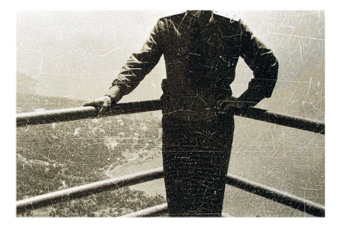 «Мужчина в военной форме позирует перед камерой, стоя на открытой террасе, расположенной где-то высоко в горах. Под ним – далеко внизу – море бесшовно сливается с небом, формируя однородный план. <…> Этот портрет мог бы быть вполне типичным примером фотографии «из отпуска», если бы не отсутствие одной важной детали: головы мужчины. Фигура военного обрезана на уровне его плеч. Но <…> фотография производит на редкость умиротворенное впечатление. При всей своей обезглавленности фигура не теряет ни уверенности в себе, ни ощущения контроля над ситуации».