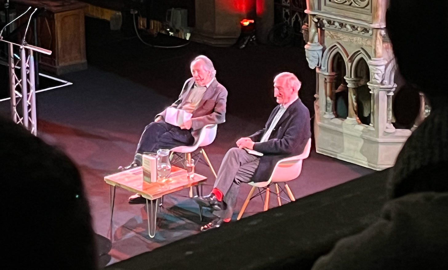 Макьюэн говорит, что сел готовиться ко встрече за три недели до, и принялся разглядывать полки с книгами Барнса. Говорит с грустным смешком: «И всё это, все эти пятьдесят лет сжались до трех с половиной полок». Барнс то ли кивает, то ли качает головой. Чуть позже они, конечно, шутят про историю мира в десяти с половиной главах. Минут двадцать беседуют о том о сем, и Барнс мягко говорит: